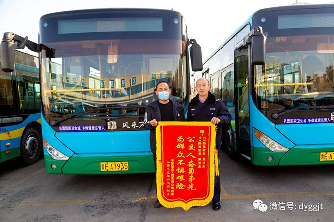 2023年12月8日,東營旭東工程公司的代表來到東營公交集團汽車七隊贈送一面錦旗,上面寫著“公交人奮勇爭先,為群眾不懼艱險”的字樣。這時大家才知道,原來是兩位公交駕駛員見義勇為幫助他們滅了一輛正在自燃的小貨車。