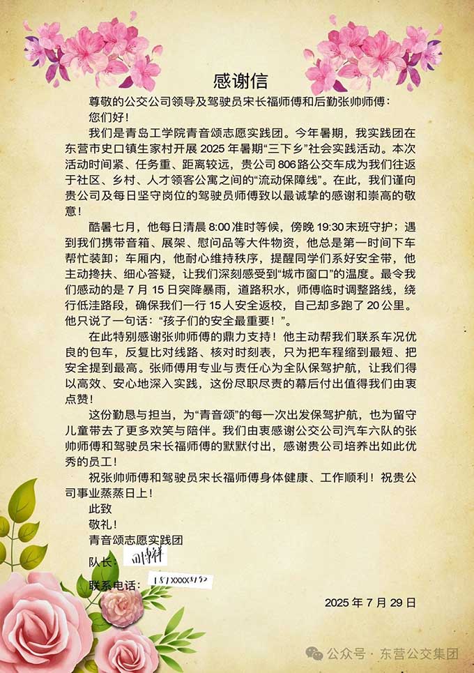 原來,在今年的暑假期間,青音頌志愿實(shí)踐團(tuán)在東營市史口鎮(zhèn)生家村開展2025年暑期“三下鄉(xiāng)”社會實(shí)踐活動,負(fù)責(zé)本次806路班車任務(wù)的宋長福細(xì)致入微的服務(wù),讓志愿團(tuán)的師生深受感動。宋長福師傅在執(zhí)行本次班車任務(wù)過程中,自清晨8:00的準(zhǔn)時等候,到傍晚19:30分的守護(hù),從幫助師生搬運(yùn)大件行李,到行車中的安全提醒,細(xì)心答疑,特別是在7月15日突降暴雨時及時調(diào)整路線,規(guī)避積水區(qū)域,為保障了師生15人的安全返校,給予了最大的安全守護(hù)!